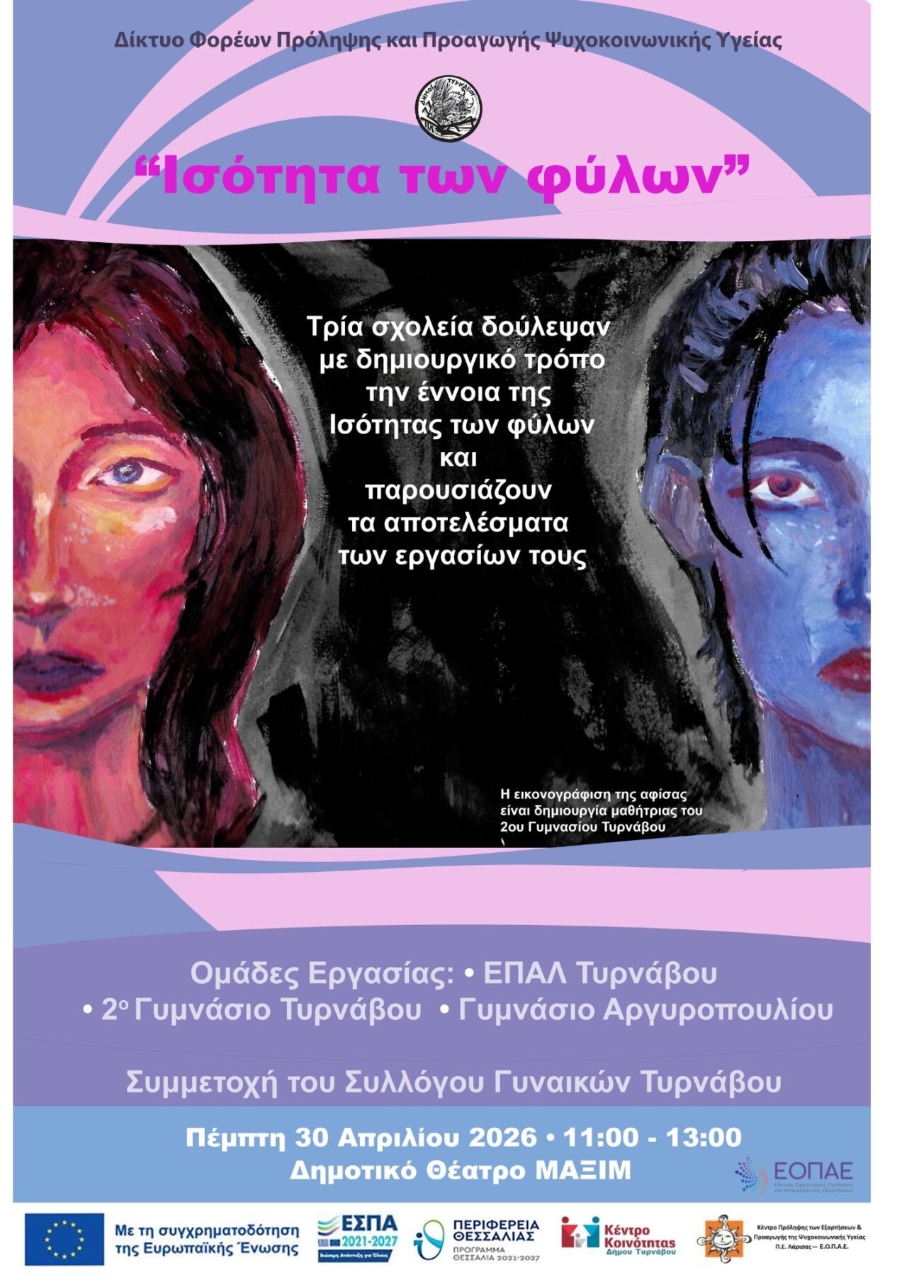 Το Κέντρο Κοινότητας του Δήμου Τυρνάβου σε συνεργασία με το Κέντρο Πρόληψης του ΕΠΟΑΕ στο πλαίσιο των εργασιών του Δικτύου Φορέων Πρόληψης και Προαγωγής Ψυχοκοινωνικής Υγείας του Δήμου Τυρνάβου πραγματοποιούν την εκδήλωση με θέμα: «Ισότητα των Φύλων»
