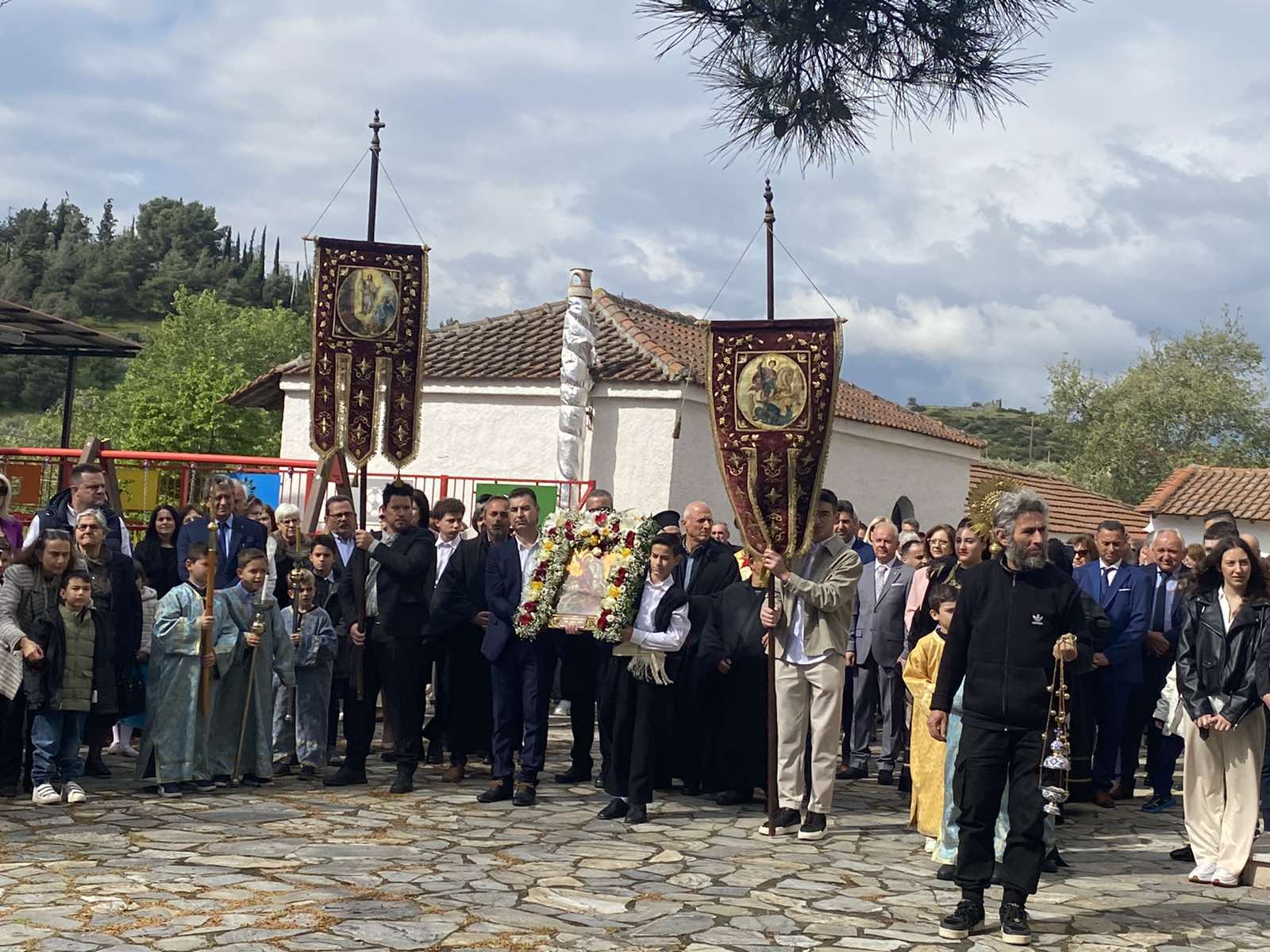 Οι καβαλάρηδες όπως κάθε χρόνο παρέλαβαν στο προαύλιο της εκκλησίας από τους ιερείς την εικόνα του Αγίου και με πομπή στους δρόμους γύρω από την πλατεία ακολουθούμενοι από τους κατοίκους και τους επισκέπτες, κατέληξαν στο προαύλιο της εκκλησίας, όπου έγινε η αρτοκλασία.
