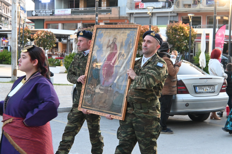 Στην κεφαλή της πομπής βρισκόταν η Φιλαρμονική του Δήμου Τυρνάβου, δίνοντας τον ρυθμό, ενώ το θέαμα των περίπου 15 αλόγων και της παραδοσιακής άμαξας που μετέφερε την εικόνα του Αγίου Γεωργίου προκάλεσε ρίγη συγκίνησης στους παρευρισκόμενους. Την ιερή εικόνα, την εικόνα της Αναστάσεως και το λείψανο πλαισίωσε άγημα Εφέδρων Αξιωματικών, τιμώντας τον στρατιωτικό Άγιο.