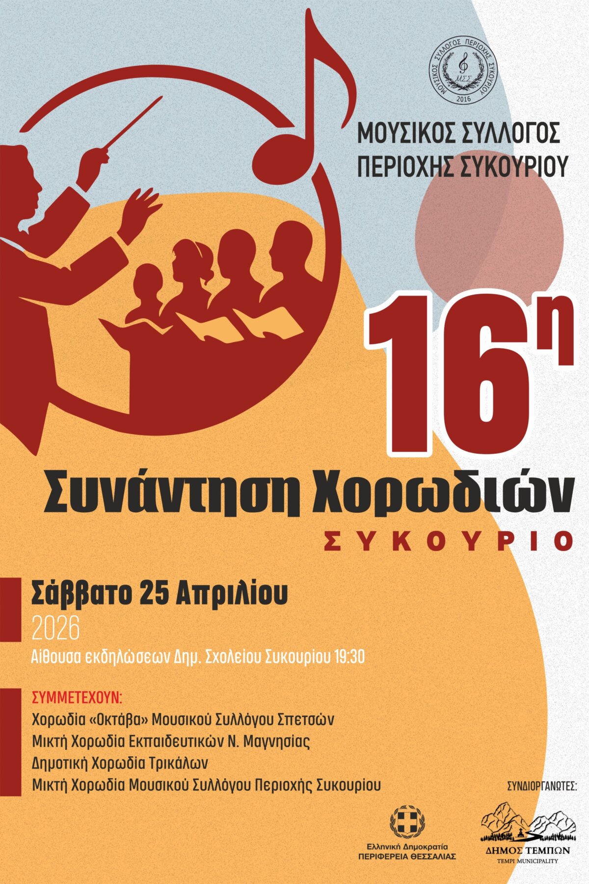 Το Σάββατο 25 Απριλίου 2026 και ώρα 19:30 θα πραγματοποιηθεί η 16η Συνάντηση Χορωδιών στο Συκούριο, στην αίθουσα εκδηλώσεων του Δημοτικού Σχολείου Συκουρίου.