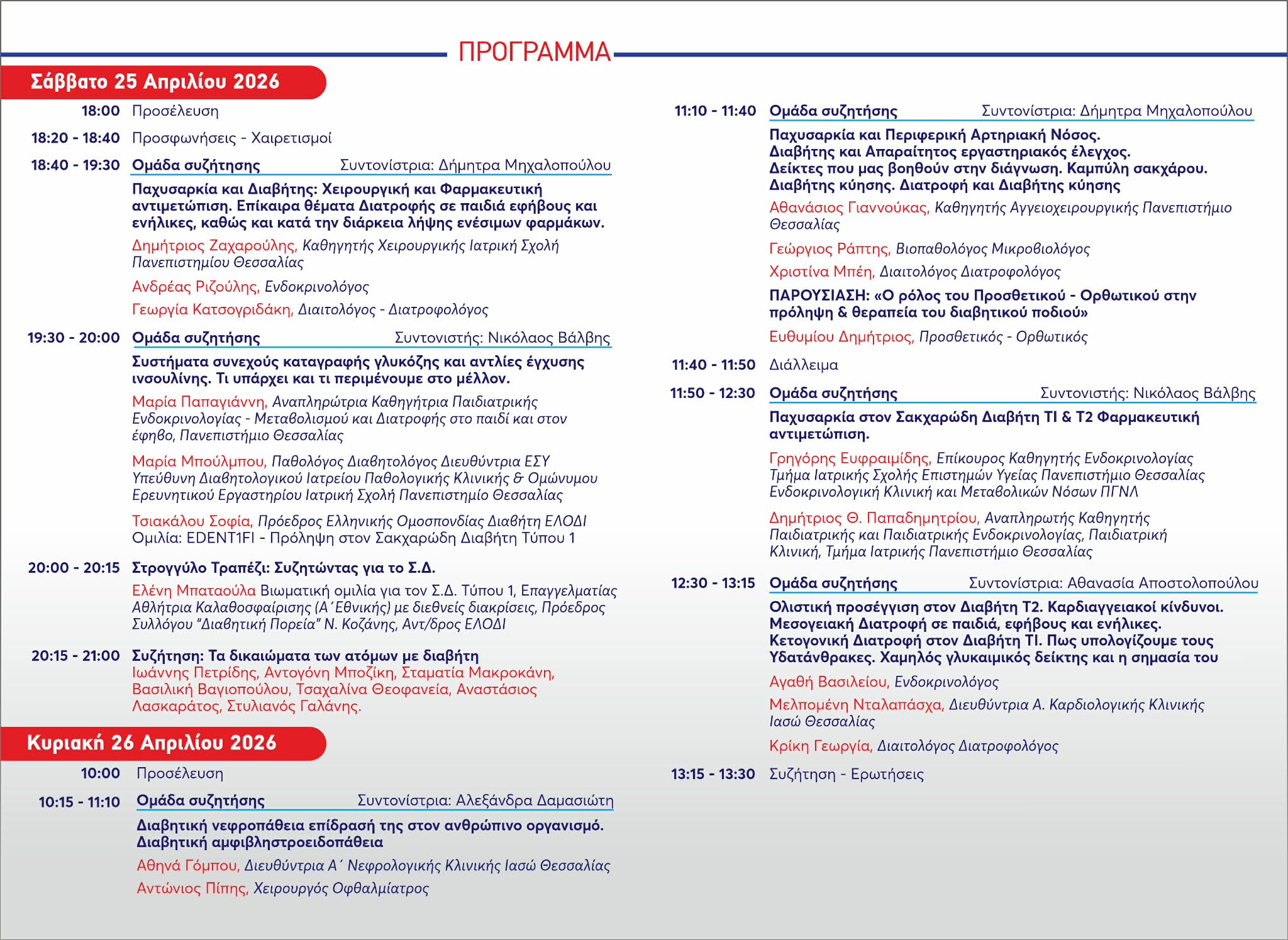 Κατά τη διάρκεια της διημερίδας, εξαίρετοι επιστήμονες θα μεταδώσουν τις γνώσεις τους πάνω σε θέματα που αφορούν τον σακχαρώδη διαβήτη, ενώ παράλληλα θα υπάρχει διανομή προϊόντων χαμηλού γλυκαιμικού δείκτη, καθώς και δωρεάν πελματογραφήματα για τους συμμετέχοντες.