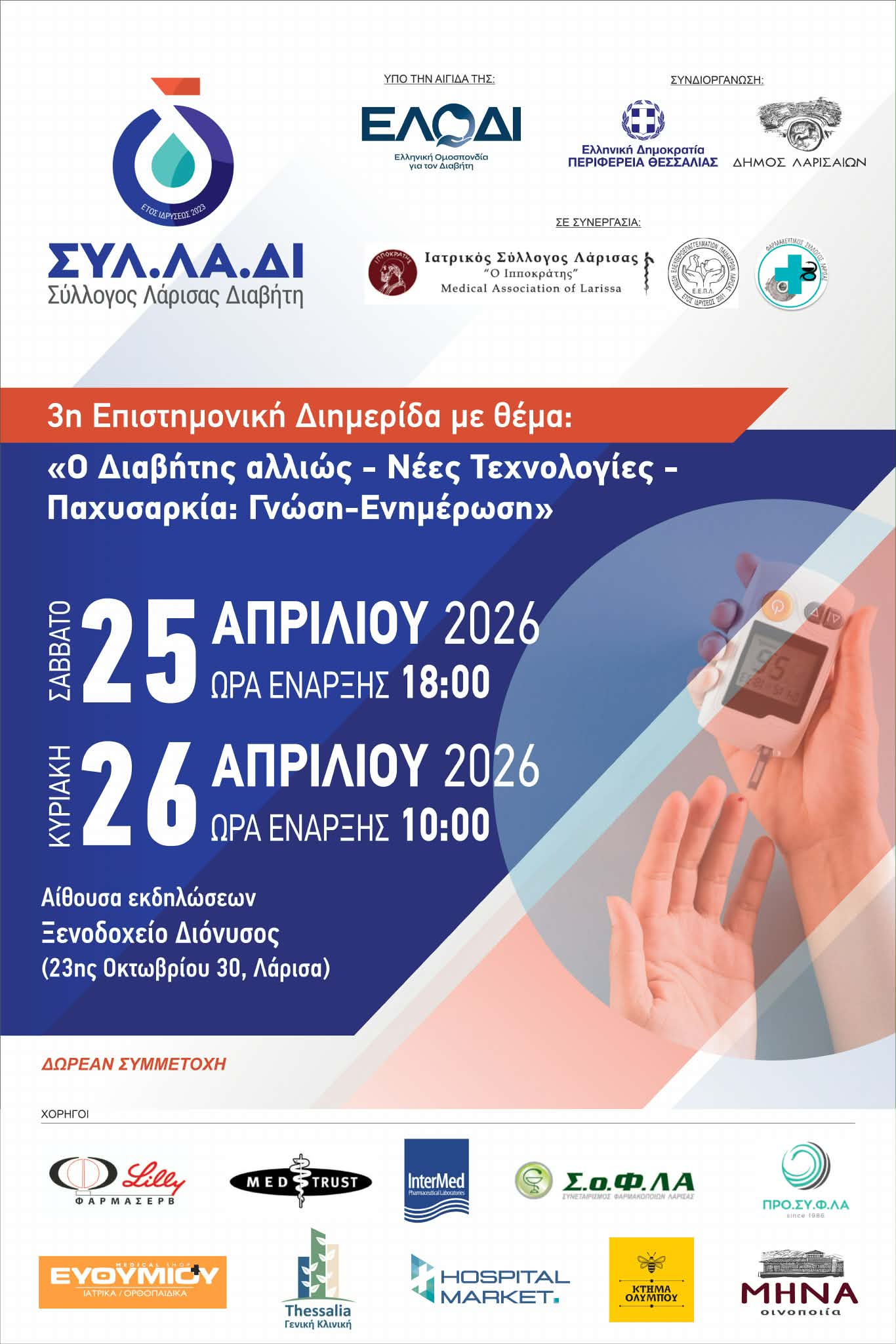 Ο Σύλλογος Λάρισας Διαβήτη διοργανώνει την 3η Επιστημονική Διημερίδα του με θέμα: «Ο Διαβήτης αλλιως.. Νέες τεχνολογίες. Παχυσαρκία – Γνώση Ενημέρωση», η οποία θα διεξαχθεί το Σάββατο 25 Απριλίου και Κυριακή 26 Απριλίου, στην αίθουσα εκδηλώσεων του ξενοδοχείου Διόνυσος στη Λάρισα.