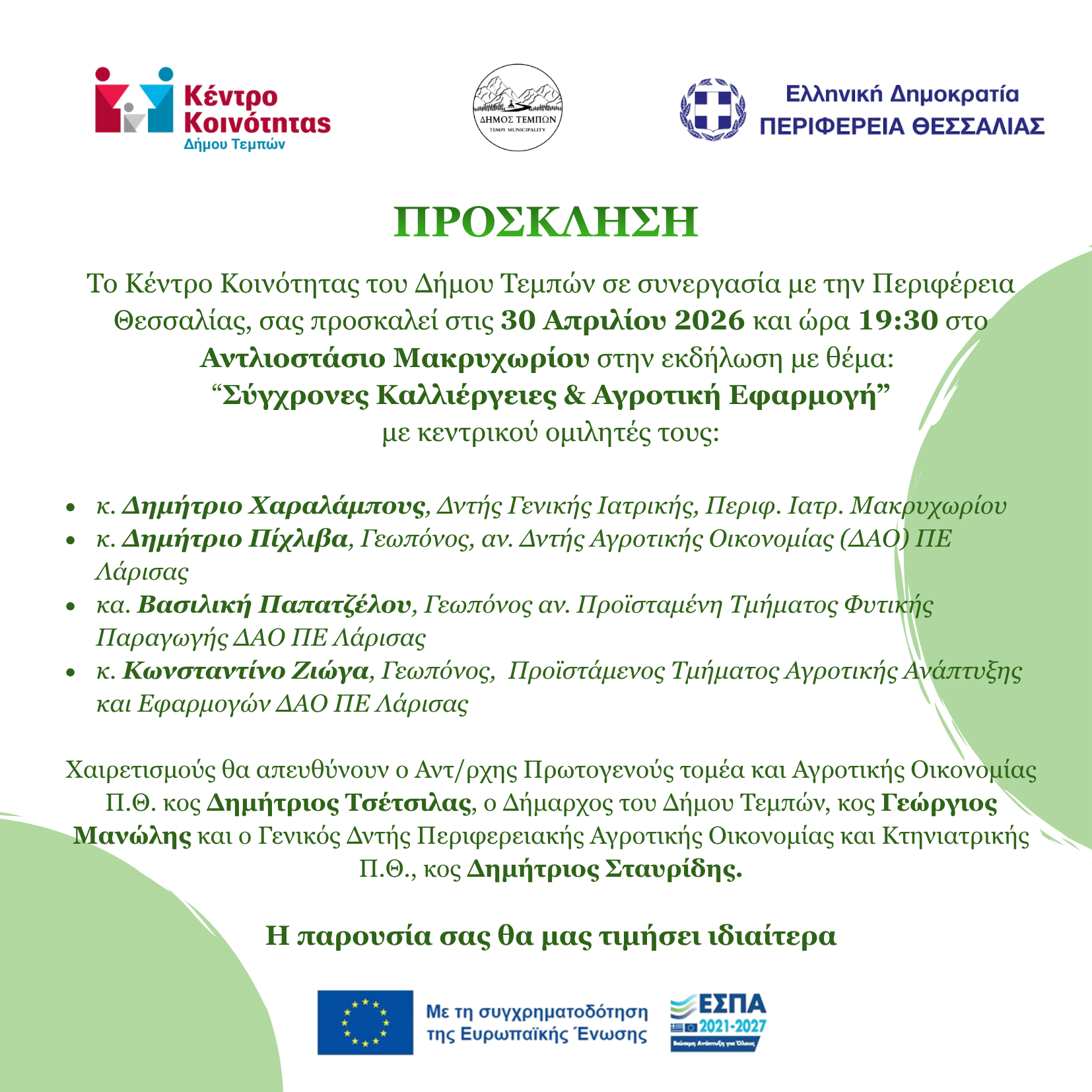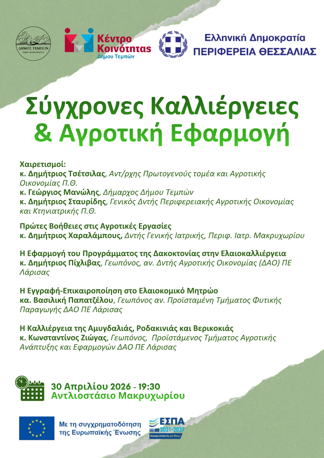 Το Κέντρο Κοινότητας Δήμου Τεμπών, σε συνεργασία με την Περιφέρεια Θεσσαλίας, προσκαλεί το κοινό στην ενημερωτική εκδήλωση με τίτλο «Σύγχρονες Καλλιέργειες & Αγροτική Εφαρμογή», η οποία θα πραγματοποιηθεί την Πέμπτη 30 Απριλίου 2026 και ώρα 19:30, στο Αντλιοστάσιο Μακρυχωρίου.