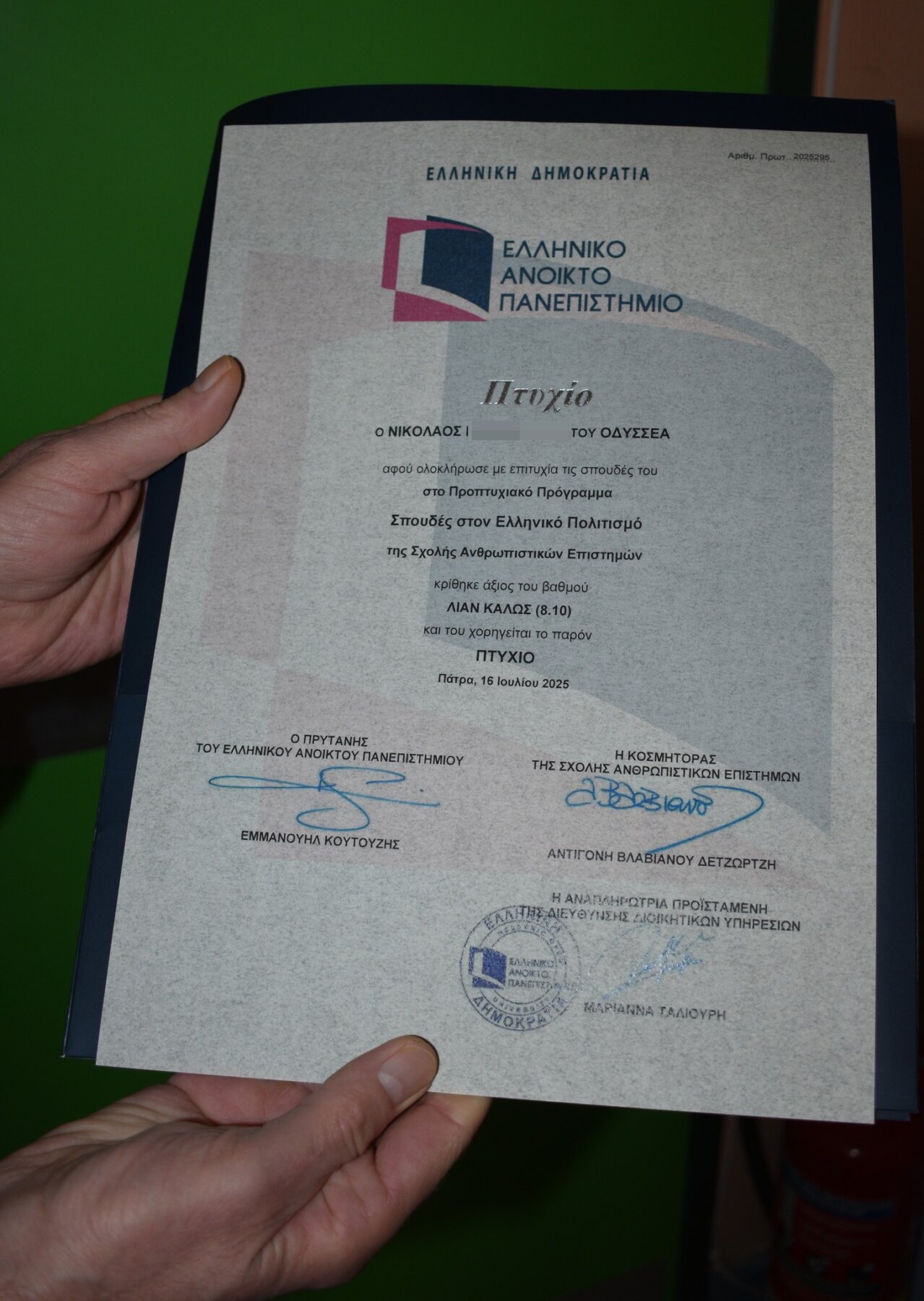 Πτυχιούχος πια καμαρώνει με το πτυχίο του στο χέρι και πιο πολύ ακόμη καμαρώνει ο Γιώργος Τράντας, Διευθυντής Δομών Εκπαίδευσης και Κατάρτισης του Σωφρονιστικού Καταστήματος Λάρισας.