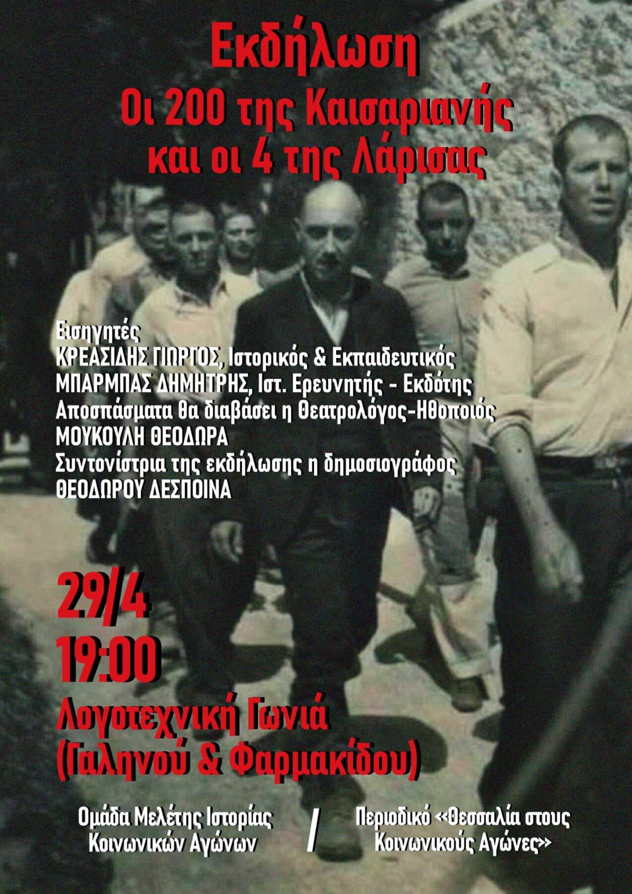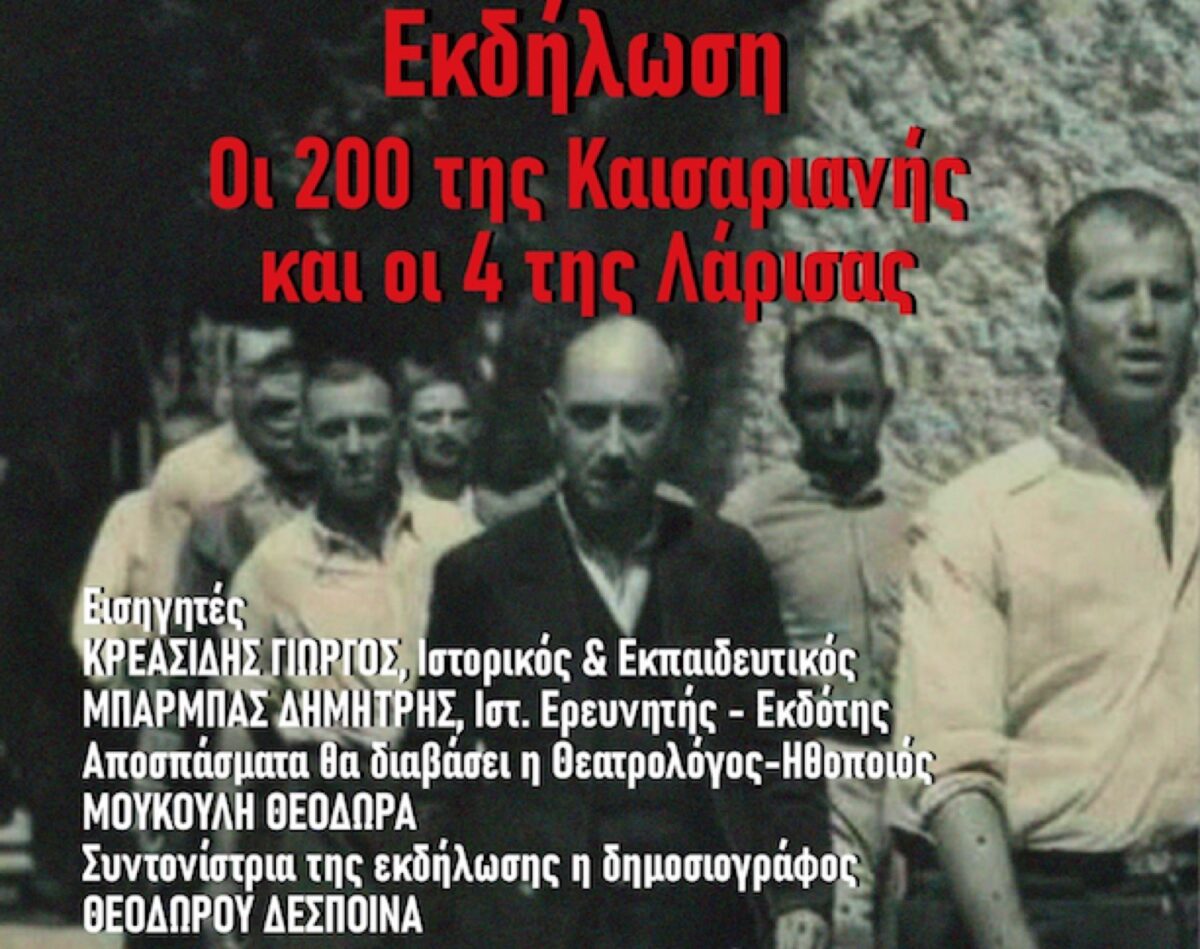 Η «Ομάδα Μελέτης Ιστορίας Κοινωνικών Αγώνων» και το περιοδικό «Θεσσαλία στους Κοινωνικούς Αγώνες», στα πλαίσια των εκδηλώσεων της Πρωτομαγιάς, προσκαλούν το κοινό στην εκδήλωση που διοργανώνουν την Τετάρτη 29 Απρίλη 2026, ώρα 19.00΄, στη «Λογοτεχνική Γωνιά» (Φαρμακίδου και Γαληνού), με θέμα: ΟΙ 200 ΤΗΣ ΚΑΙΣΑΡΙΑΝΉΣ & η συνεισφορά σπονδής της Λάρισας