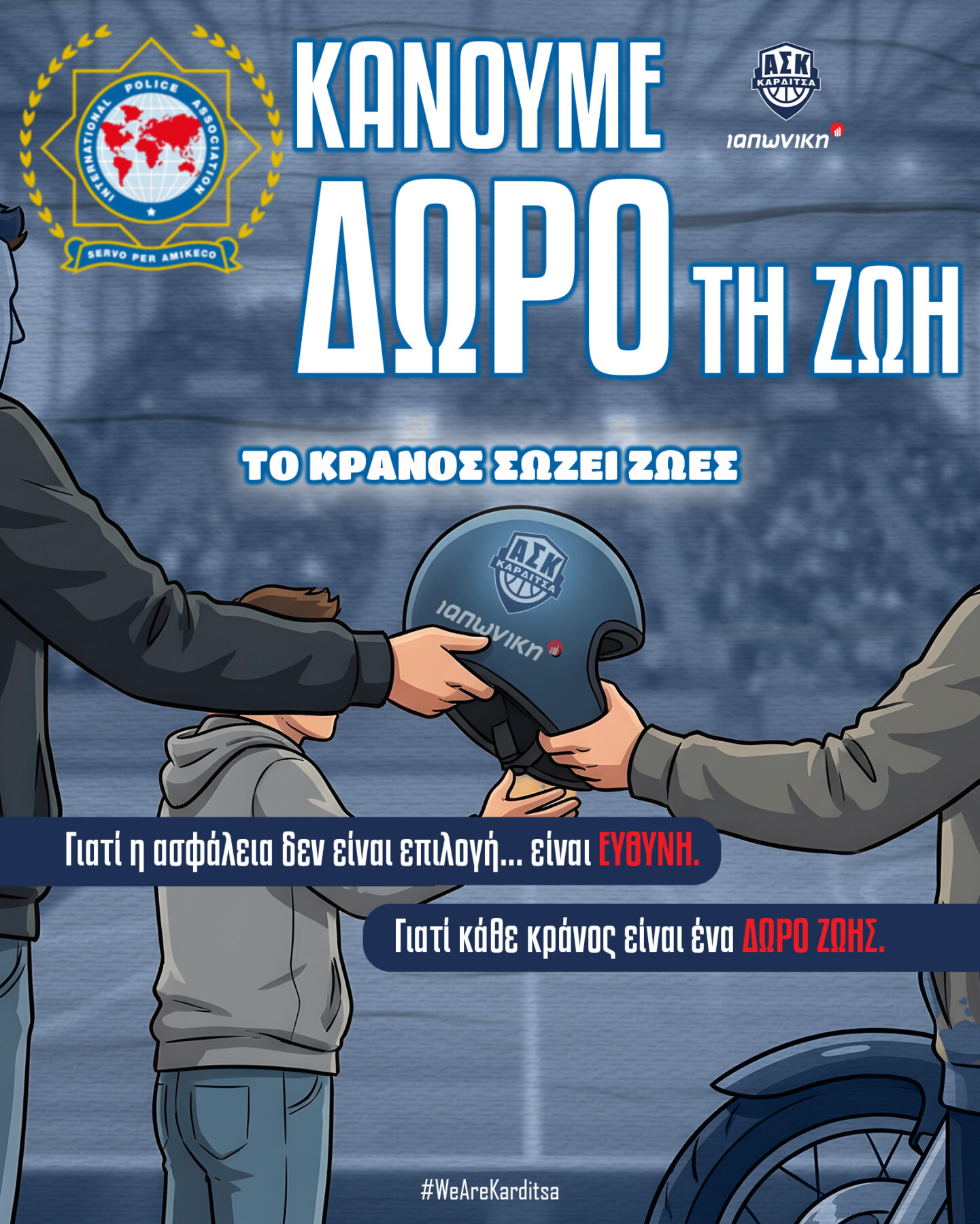 Με το σύνθημα «Όλα παίζονται στο κεφάλι σου, φόρα κράνος» συνέχισε τις δράσεις της για την οδική ασφάλεια και συγκεκριμένα για την απόλυτη και σωστή χρήση του κράνους από όλους τους οδηγούς δικύκλων, η τοπική διοίκηση Καρδίτσας της Διεθνούς Ένωσης Αστυνομικών.