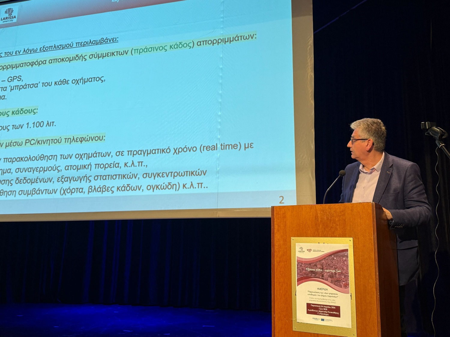 Τέλος, ο κ.Βασίλης Χρυσαφίδης, Μηχανολόγος Μηχανικός, τμήμα Μελετών Συστημάτων Διαχείρισης Απορριμμάτων, αναφέρθηκε συγκεκριμένα στα συστήματα που έχουν τοποθετηθεί σε απορριμματοφόρα και συλλέγουν στοιχεία αναφορικά με τα απορρίμματα εντός των κάδων, στη δυνατότητα παρακολούθησης σε πραγματικό χρόνο των κινήσεων του στόλου καθαριότητας, καθώς και την ανάλυση δεδομένων.