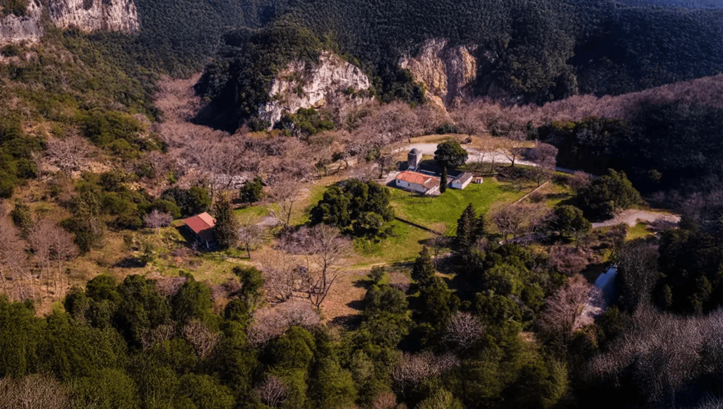 Ο χώρος έχει και μια έντονη ιστορική διάσταση, με τη μονή να χρονολογείται από τα τέλη του 16ου αιώνα και να διατηρεί μέχρι σήμερα στοιχεία όπως ο οχυρωματικός πύργος και οι παλιές τοιχογραφίες του 17ου αιώνα. Λίγο πιο πέρα, μέσα στον βράχο, βρίσκονται τα ασκηταριά που προσθέτουν μια πιο “μυστική” πλευρά στο τοπίο, σαν να ανοίγεται ξαφνικά ένα κομμάτι άλλης εποχής μέσα στη φύση.