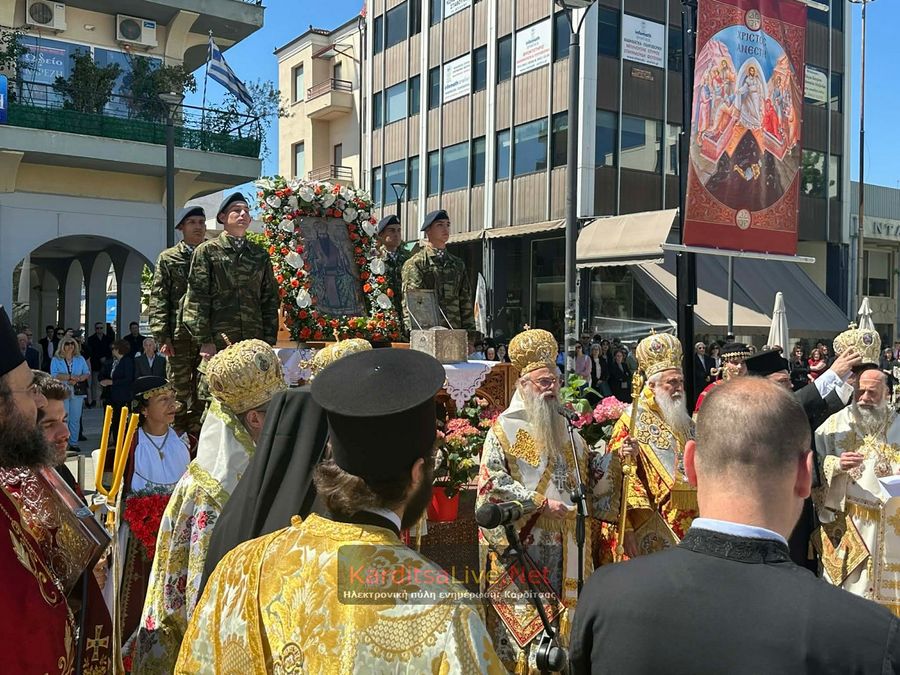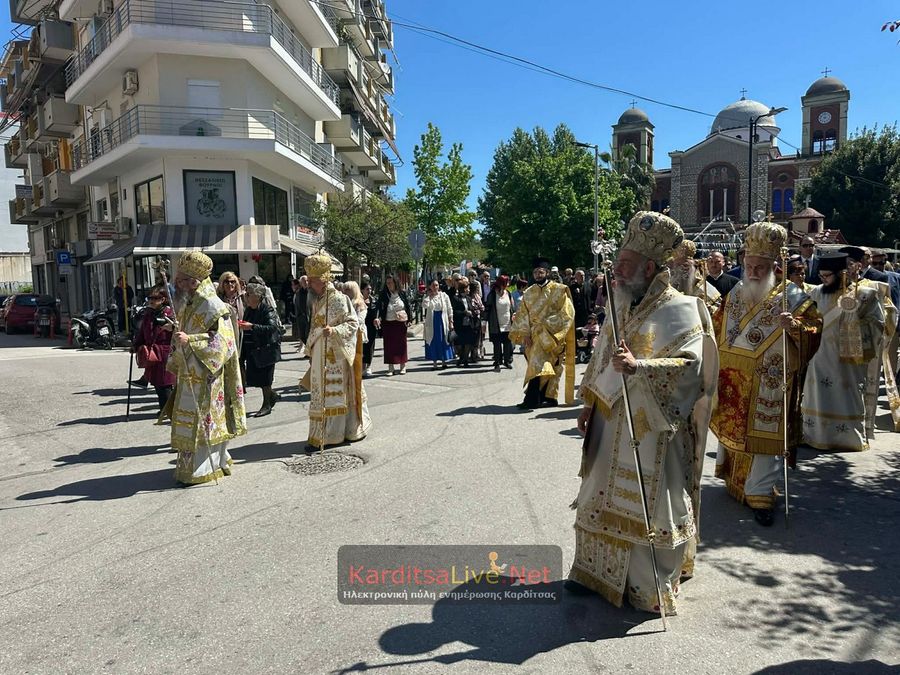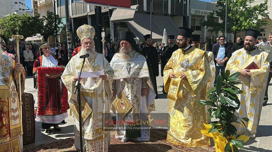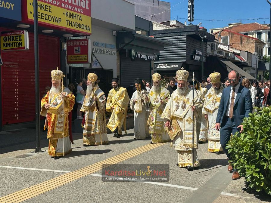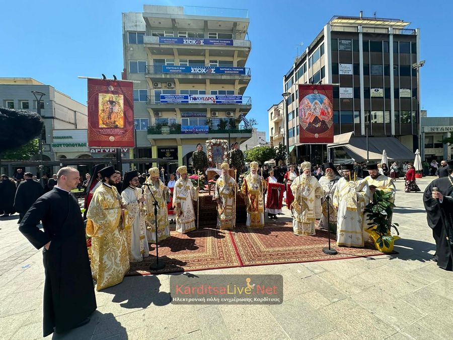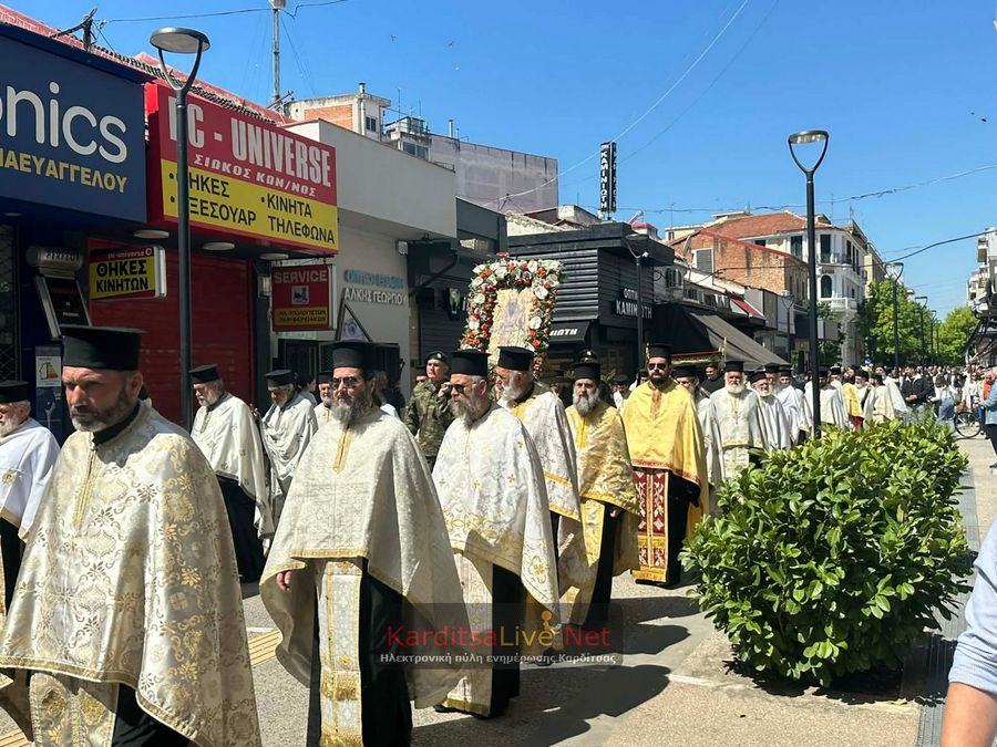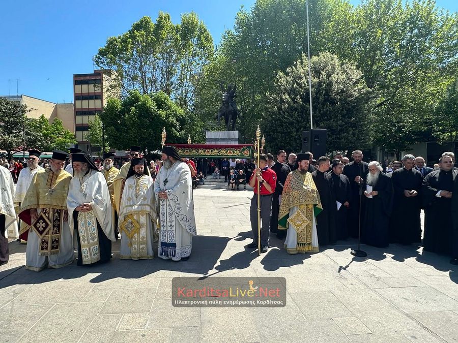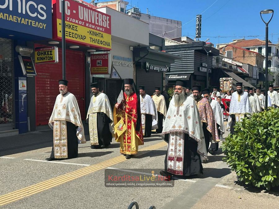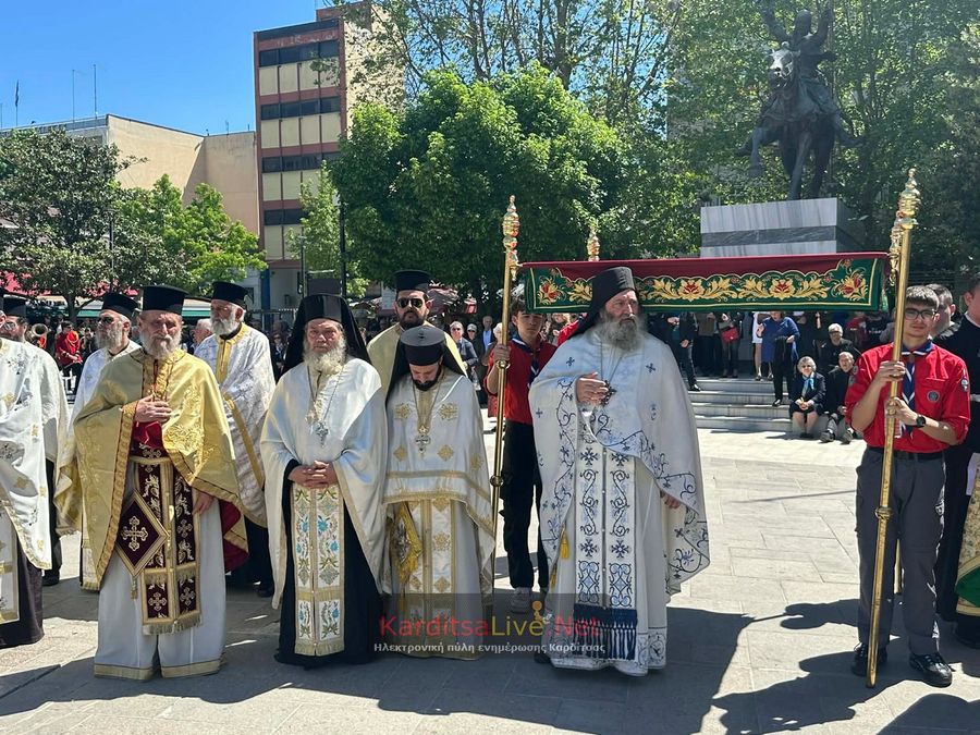 Ακολούθησε η Λιτάνευση στο πιο κεντρικό σημείο της Πόλης όπου η πομπή πρωτοστατούντος του Σεβασμιότατου Μητροπολίτη Θεσσαλιώτιδος και Φαναριοφερσάλων κ. Τιμόθεου, λοιπών Ιεραρχών, αρχών και πλήθους κόσμου ξεκίνησε από τον Μητροπολιτικό Ναό Αγίου Κωνσταντίνου και Ελένης, συνέχισε να κινείται επί των οδών Ιεζεκιήλ και Ανδρέα Παπανδρέου για να καταλήξει μέσω του πεζόδρομου Δ. Τερτίπη στην Πλατεία για την Δέηση. Την Ιερή Κάρα και Εικόνα συνόδευαν καθόλη την πορεία με τις Θρησκευτικές τους μελωδίες οι Φιλαρμονικές των Δήμων Καρδίτσας και Παλαμά αλλά και Άγημα του Κέντρου Εκπαιδεύσεως Στρατονομίας Καρδίτσας και της Σχολής Αστυφυλάκων Μουζακίου μαζί με τμήματα κοινωνικών και πολιτιστικών φορέων της πόλης τα οποία και απέδιδαν τιμές.