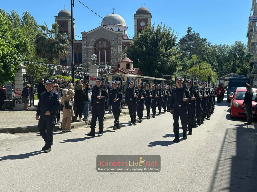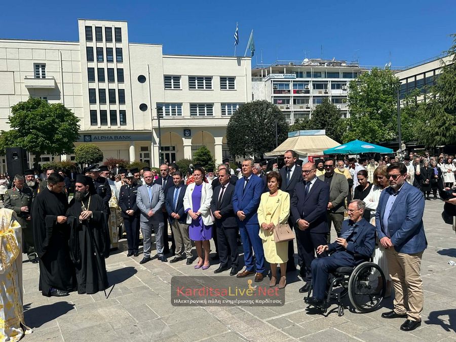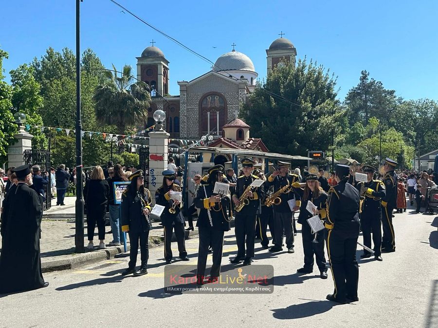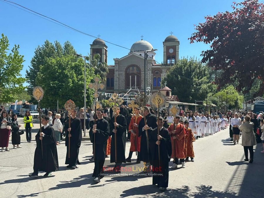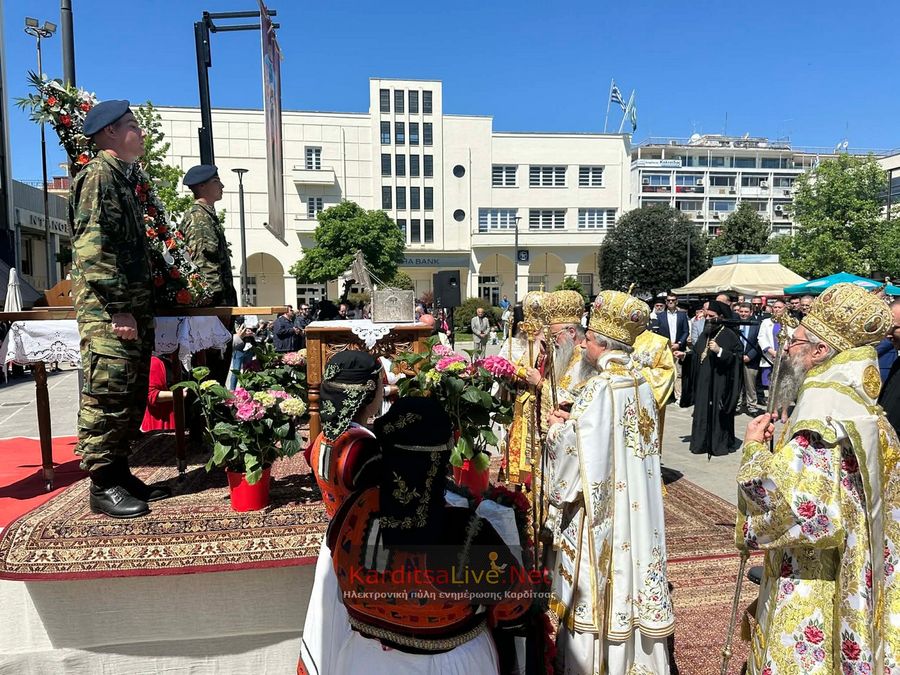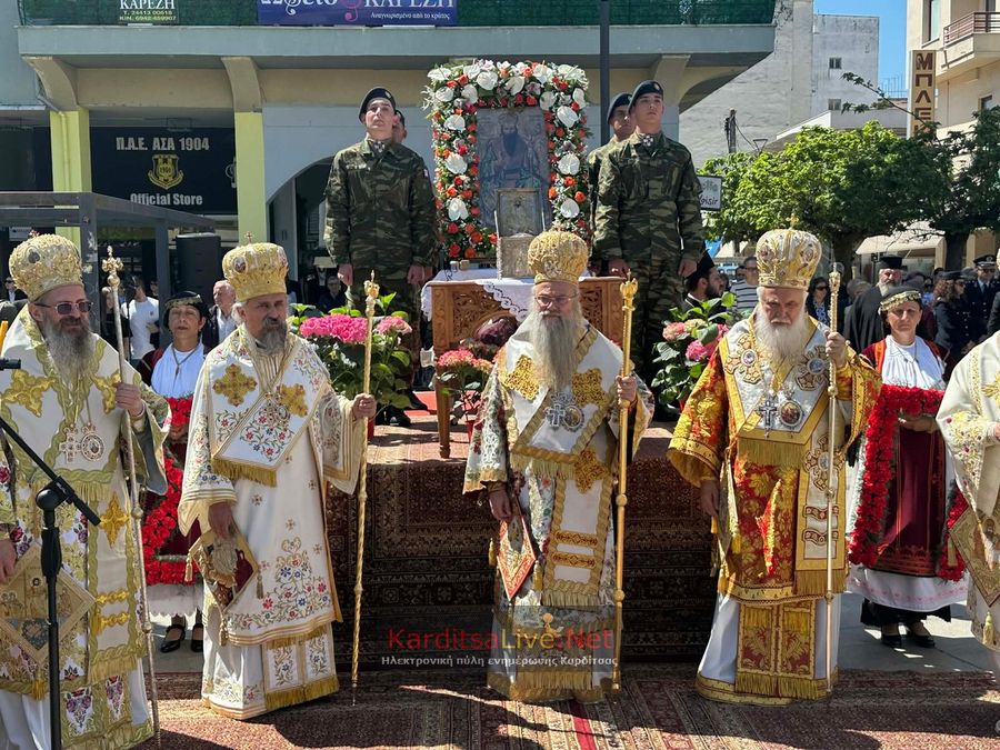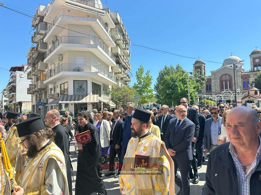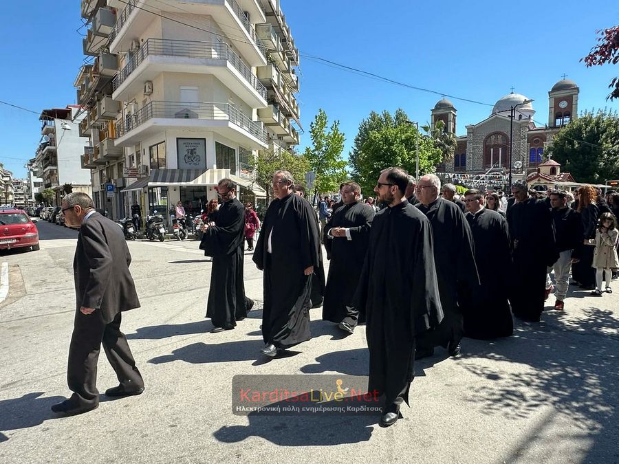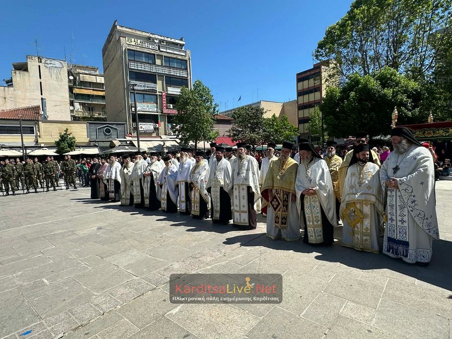 Ακολούθησε η Λιτάνευση στο πιο κεντρικό σημείο της Πόλης όπου η πομπή πρωτοστατούντος του Σεβασμιότατου Μητροπολίτη Θεσσαλιώτιδος και Φαναριοφερσάλων κ. Τιμόθεου, λοιπών Ιεραρχών, αρχών και πλήθους κόσμου ξεκίνησε από τον Μητροπολιτικό Ναό Αγίου Κωνσταντίνου και Ελένης, συνέχισε να κινείται επί των οδών Ιεζεκιήλ και Ανδρέα Παπανδρέου για να καταλήξει μέσω του πεζόδρομου Δ. Τερτίπη στην Πλατεία για την Δέηση. Την Ιερή Κάρα και Εικόνα συνόδευαν καθόλη την πορεία με τις Θρησκευτικές τους μελωδίες οι Φιλαρμονικές των Δήμων Καρδίτσας και Παλαμά αλλά και Άγημα του Κέντρου Εκπαιδεύσεως Στρατονομίας Καρδίτσας και της Σχολής Αστυφυλάκων Μουζακίου μαζί με τμήματα κοινωνικών και πολιτιστικών φορέων της πόλης τα οποία και απέδιδαν τιμές.