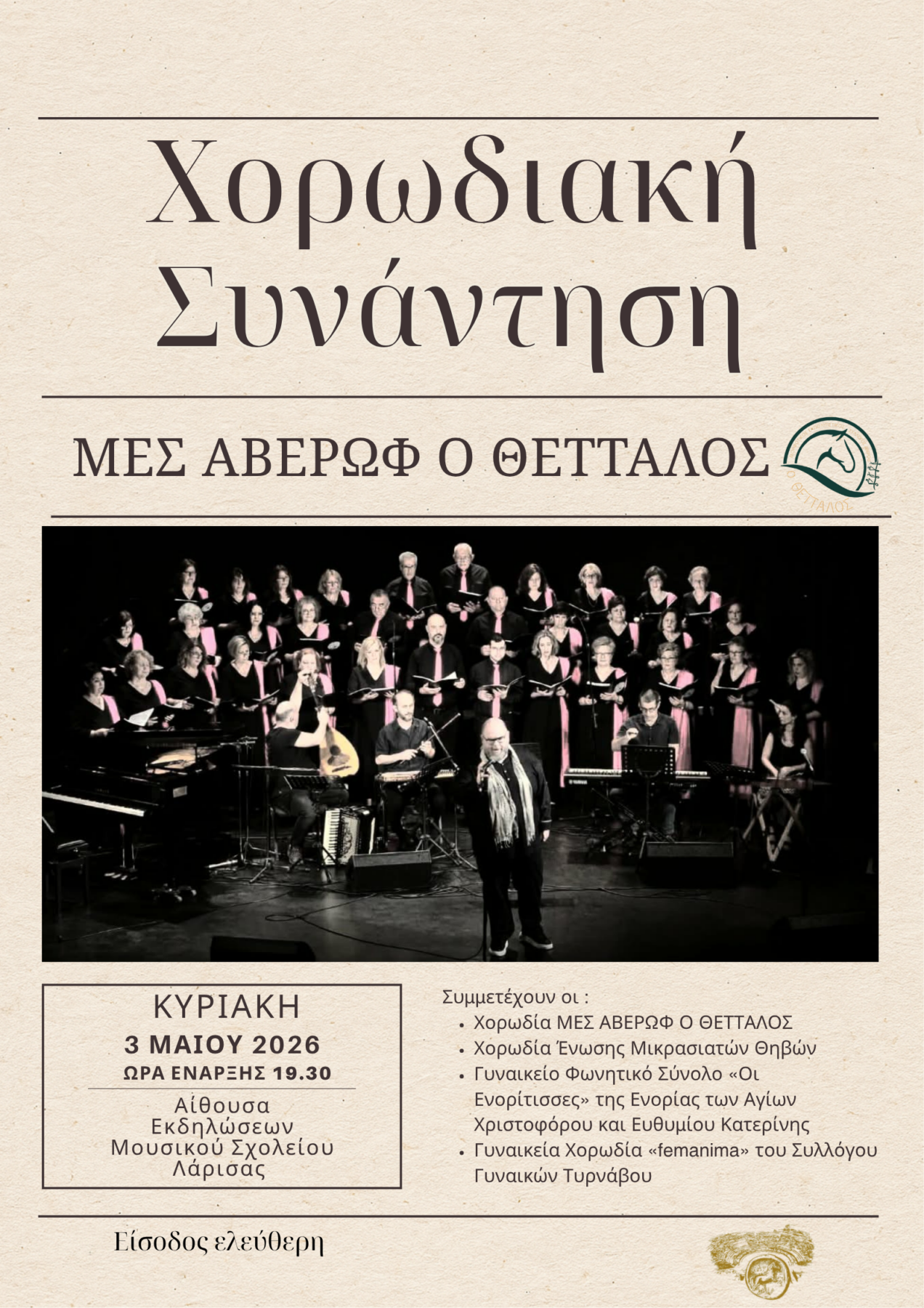 Η καρδιά της παραδοσιακής μουσικής και της χορωδιακής τέχνης ετοιμάζεται να χτυπήσει δυνατά στην πόλη μας. Ο Μ.Ε.Σ. Αβέρωφ «ο ΘΕΤΤΑΛΟΣ» διοργανώνει μια μεγάλη Χορωδιακή Συνάντηση την Κυριακή 3 Μαΐου 2026 και ώρα 19:30, στην Αίθουσα Εκδηλώσεων του Μουσικού Σχολείου Λάρισας. Η εκδήλωση τελεί υπό την αιγίδα της Αντιδημαρχίας Πολιτισμού του Δήμου Λαρισαίων, ενώ την καλλιτεχνική επιμέλεια υπογράφει ο καθηγητής παραδοσιακής και βυζαντινής μουσικής, Γεώργιος Τερζούδης.