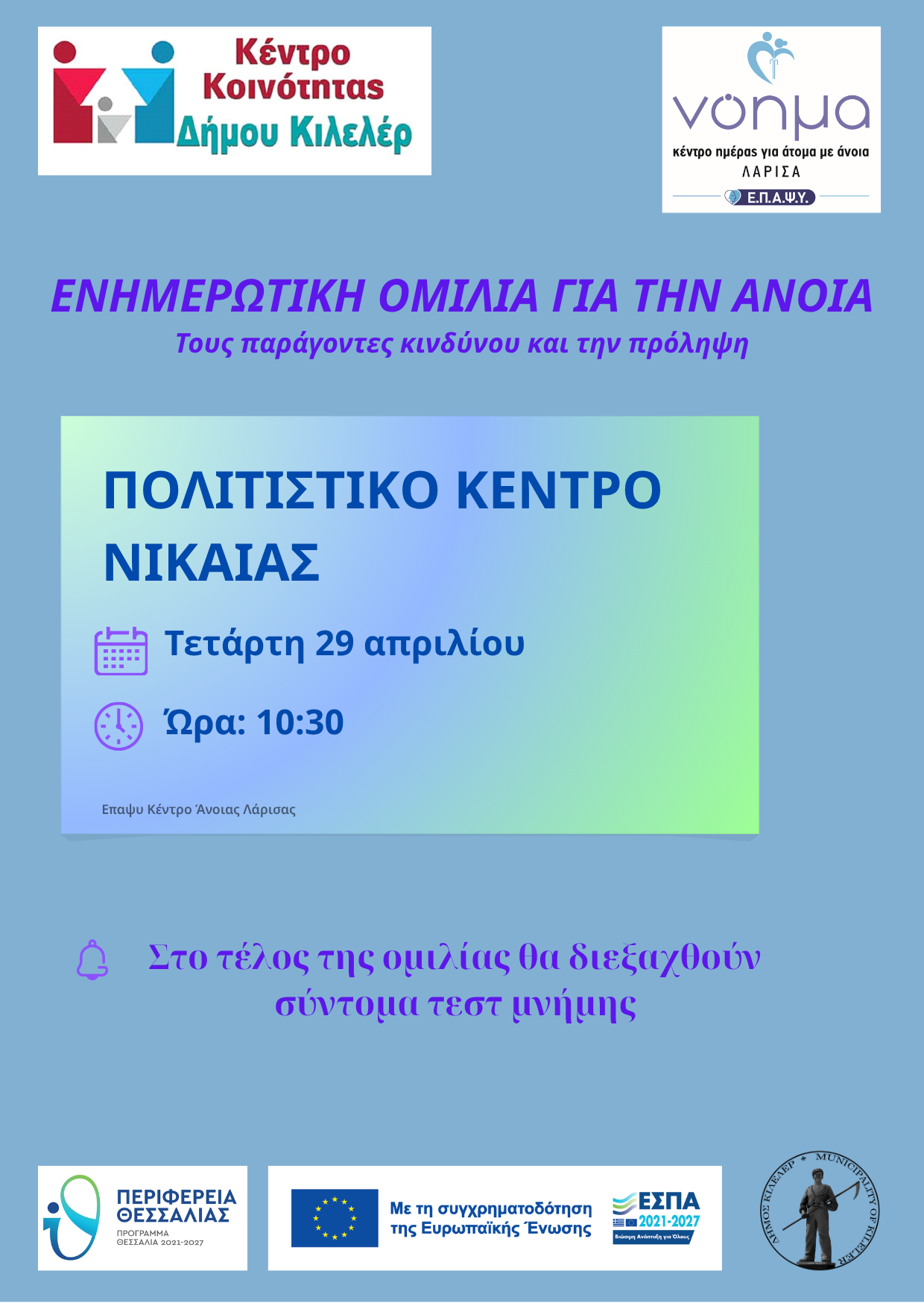 Το Κέντρο Κοινότητας του Δήμου Κιλελέρ και το Κέντρο Ημέρας για άτομα με άνοια «Νόημα» διοργανώνουν ενημερωτική ομιλία για την άνοια, τους παράγοντες κινδύνου και την πρόληψη στο πολιτιστικό Κέντρο Νίκαιας την Τετάρτη 29 Απριλίου και ώρα 10:30.