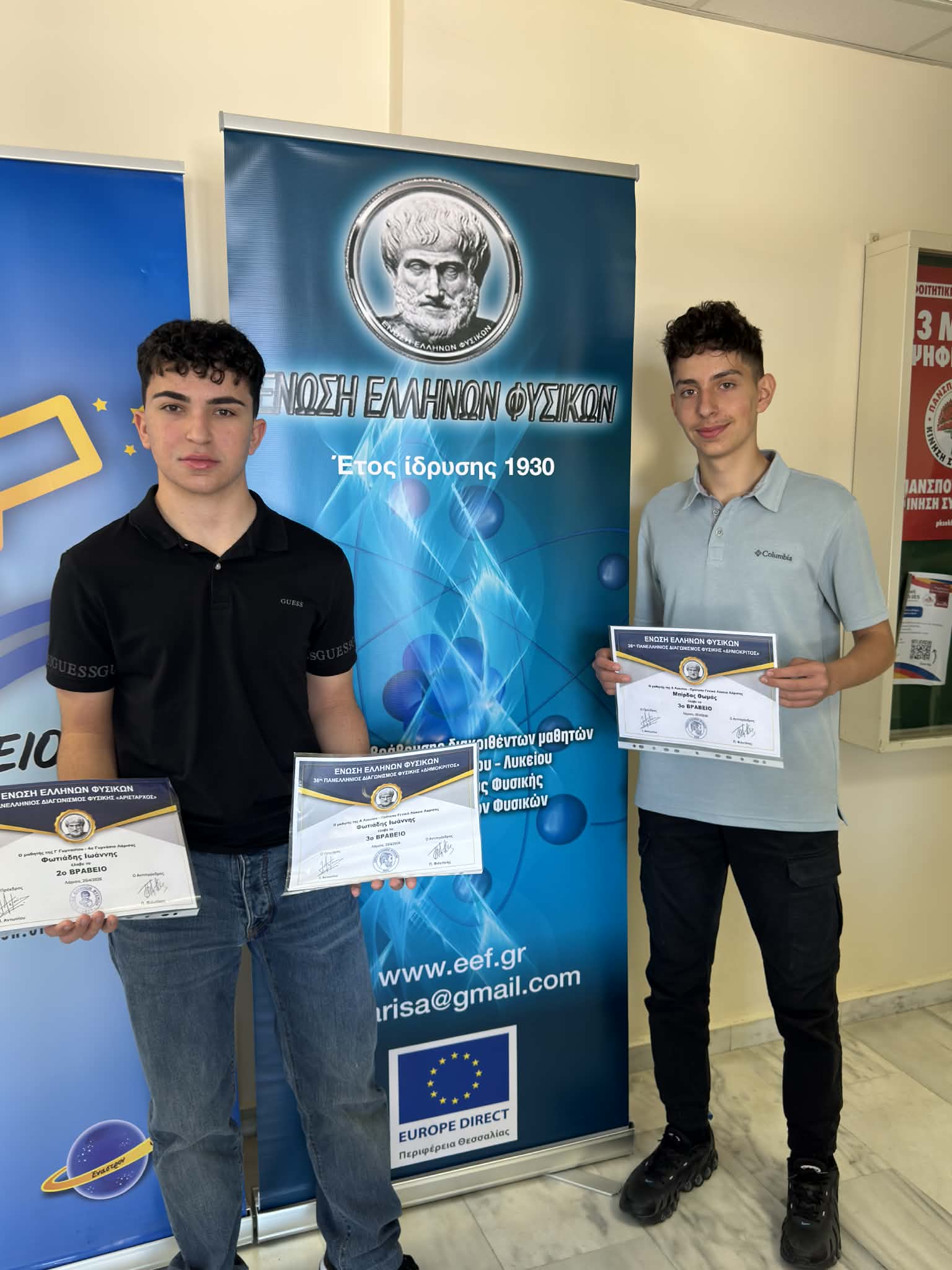 Στο πλαίσιο του Συνεδρίου που πραγματοποίησε η Ένωση Ελλήνων Φυσικών (ΕΕΦ) στη Λάρισα, έγινε το περασμένο Σάββατο το μεσημέρι η απονομή των Βραβείων σε μαθητές που πέτυχαν υψηλή διάκριση στους πανελλήνιους διαγωνισμούς «Δημόκριτoς» και «Αρίσταρχος» που διοργάνωσε η ΕΕΦ. Μεταξύ των διακριθέντων και οι μαθητές του Προτύπου Γενικού Λυκείου Λάρισας Πάρης Νικολάου της Β΄ τάξεως που συγκαταλέχθηκε στους 25 μαθητές σε πανελλαδικό επίπεδο που κέρδισαν 1ο Βραβείο στο «Δημόκριτο» και οι Θωμάς Μπίρδας και Γιάννης Φωτιάδης της Α΄ τάξεως Λυκείου που κέρδισαν 3ο Βραβείο στον «Δημόκριτο», ενώ ο Γιάννης Φωτιάδης πήρε και το 2ο Βραβείο στον «Αρίσταρχο».