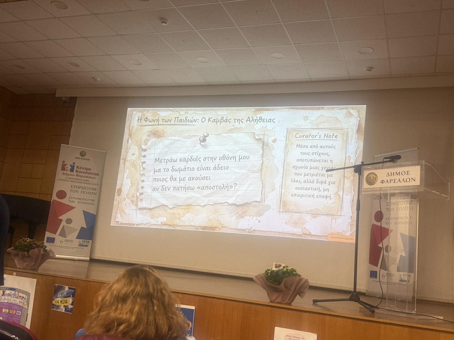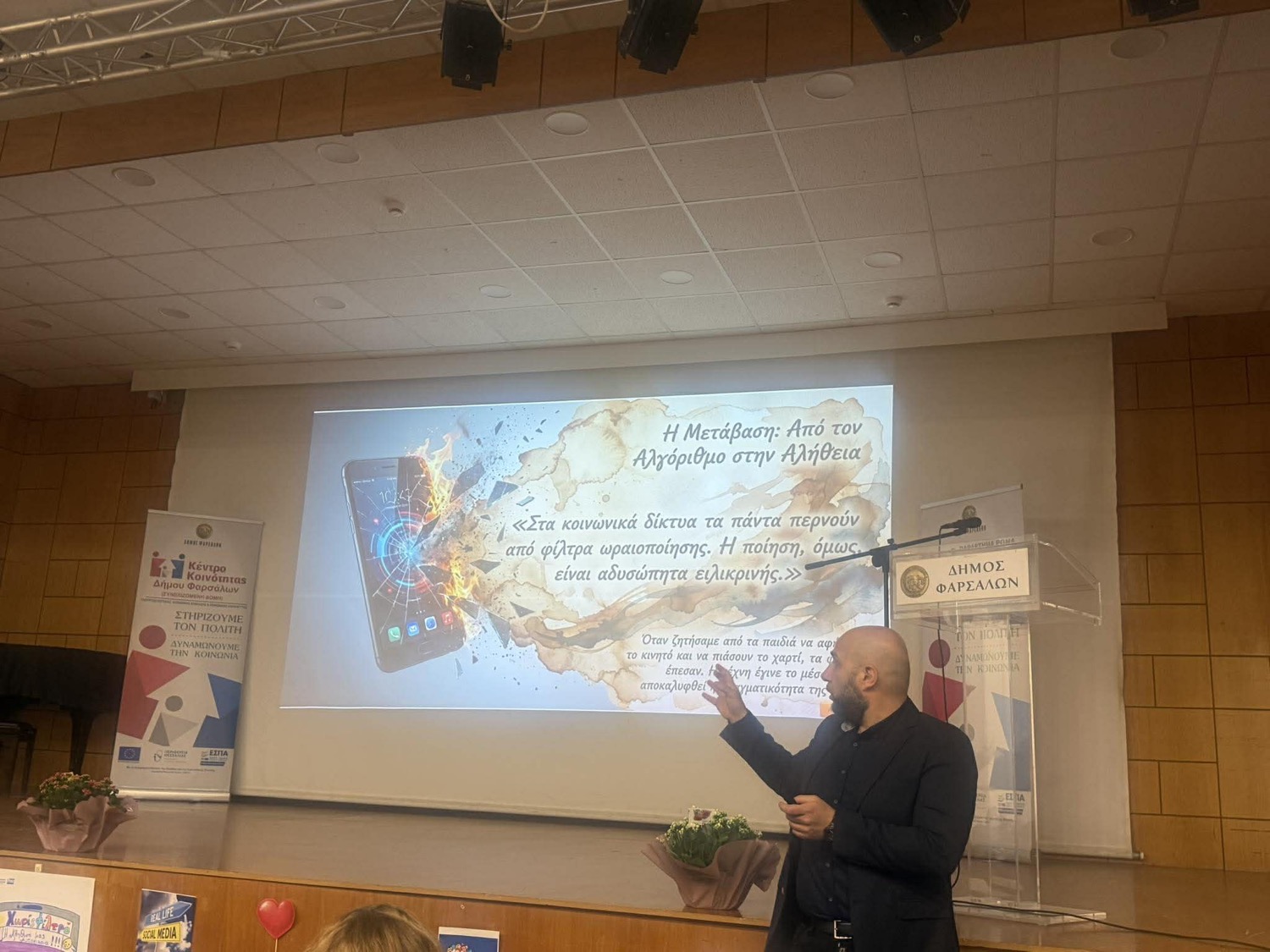 Με ιδιαίτερη επιτυχία πραγματοποιήθηκε από τα Στελέχη του Κέντρου Κοινότητας Δήμου Φαρσάλων (ΣΥΝΕΧΙΖΟΜΕΝΗ ΔΟΜΗ) την Τετάρτη 22 Απριλίου 2026 και ώρα 10:00 π.μ., στο Πολιτιστικό Κέντρο Φαρσάλων, η ολοκλήρωση της Δράσης Ευαισθητοποίησης «Ζωή Χωρίς Φίλτρο: Όταν η τέχνη αποκαλύπτει», στην οποία συμμετείχαν μαθητές της Α’ Γυμνασίου του Δήμου.