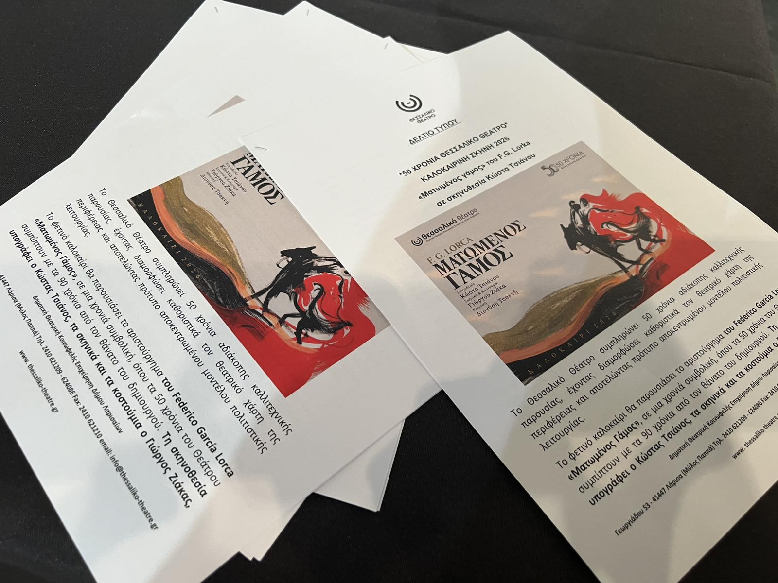 Σχετικά με την καλοκαιρινή σκηνή, η Πρόεδρος του Θεσσαλικού Θεάτρου, κ. Ελένη Σιαματά – Μπούτλα αποκάλυψε πως το φετινό καλοκαίρι θα παρουσιαστεί το αριστούργημα του Federico Garcia Lorca, «Ματωμένος Γάμος», σε μια χρονιά συμβολική, όπου τα 50 χρόνια του Θεάτρου συμπίπτουν με τα 90 χρόνια από τον θάνατο του δημιουργού. Τη σκηνοθεσία υπογράφει ο Κώστας Τσιάνος, τα σκηνικά και τα κουστούμια ο Γιώργος Ζιάκας και τη μουσική συνθέτει ο Διονύσης Τσακνής, σε μια παράσταση που συνδέει την ιστορική διαδρομή του Θεσσαλικού Θεάτρου με τη διαχρονική δύναμη της σύγχρονης τραγωδίας.