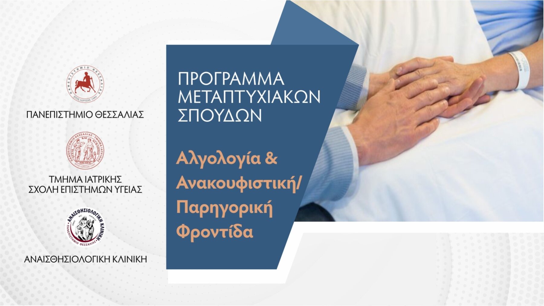 Το Τμήμα Ιατρικής της Σχολής Επιστημών Υγείας του Πανεπιστημίου Θεσσαλίας, ανακοινώνει την έναρξη υποβολής αιτήσεων για το ακαδημαϊκό έτος 2026-2027 του Προγράμματος Μεταπτυχιακών Σπουδών (Π.Μ.Σ.) με τίτλο «Αλγολογία και Ανακουφιστική/Παρηγορική Φροντίδα»